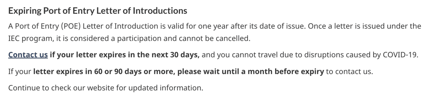 IEC ha hecho publicas actualizaciones constantes a través de este link. Aquí responden a las preguntas más frecuentes. Como ves en esta sección concreta, IEC da instrucciones especificas de cómo aplicar por la extensión de 90 días extra para entrar en Canadá con tu Working Holiday si tu fecha límite se esta acerando y tu POE esta a punto de caducar.